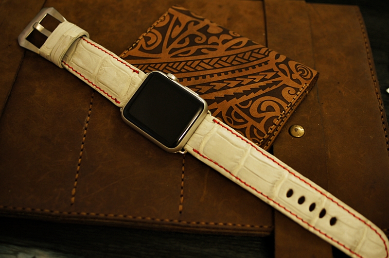 Trắng chỉ đỏ - Dây đồng hồ Cá Sấu thật cho Apple Watch 1 and 2 (Apple Watch Sport) size 38mm và 42mm